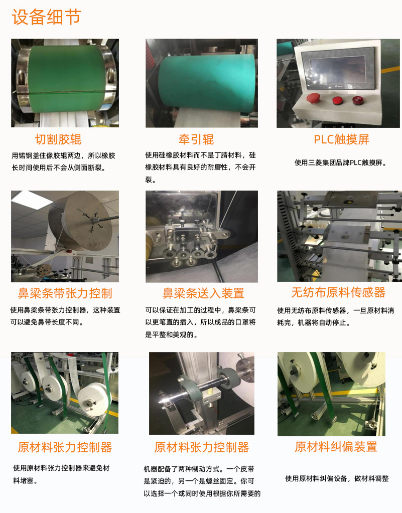 4、全自動外耳帶電焊機同時制作口罩片材和外部耳焊點部分,可節(jié)省勞動,一旦無紡布原材料在使用的過程中使用完,機器會自動停止。