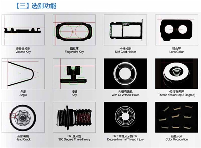 二、設(shè)備功能 也就是光學(xué)篩選機(jī)都能干嘛?檢測(cè)些什么項(xiàng)目?一般檢測(cè)項(xiàng)目從一個(gè)到二十幾個(gè)不等??蛻粢蟮某叽纭⑼庥^、顏色等都是可以檢測(cè)的。那具體都可以檢測(cè)那些呢?
