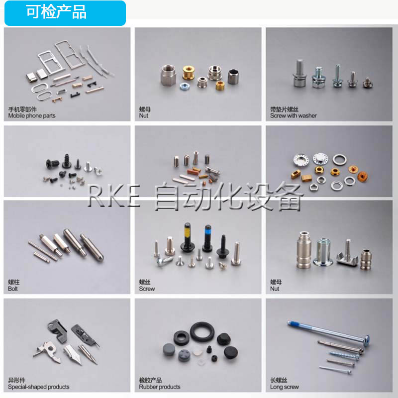 2、檢測的范圍:螺絲、螺母、汽車配件、手機零配件、航空件、塑膠件、磁芯產(chǎn)品、表面缺陷、外觀尺寸、連接器、沖壓件、字符等等,都是可以進(jìn)行檢測篩選的。