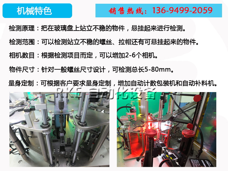 東莞瑞科自動化設備有限公司致力于自動化設備研發(fā)10余年,擁有豐富的實踐經驗,汽車長螺絲分度盤檢測,把不能站立在玻璃盤上的物件懸掛起來進行檢測,檢測的范圍廣,精度高,速度快。